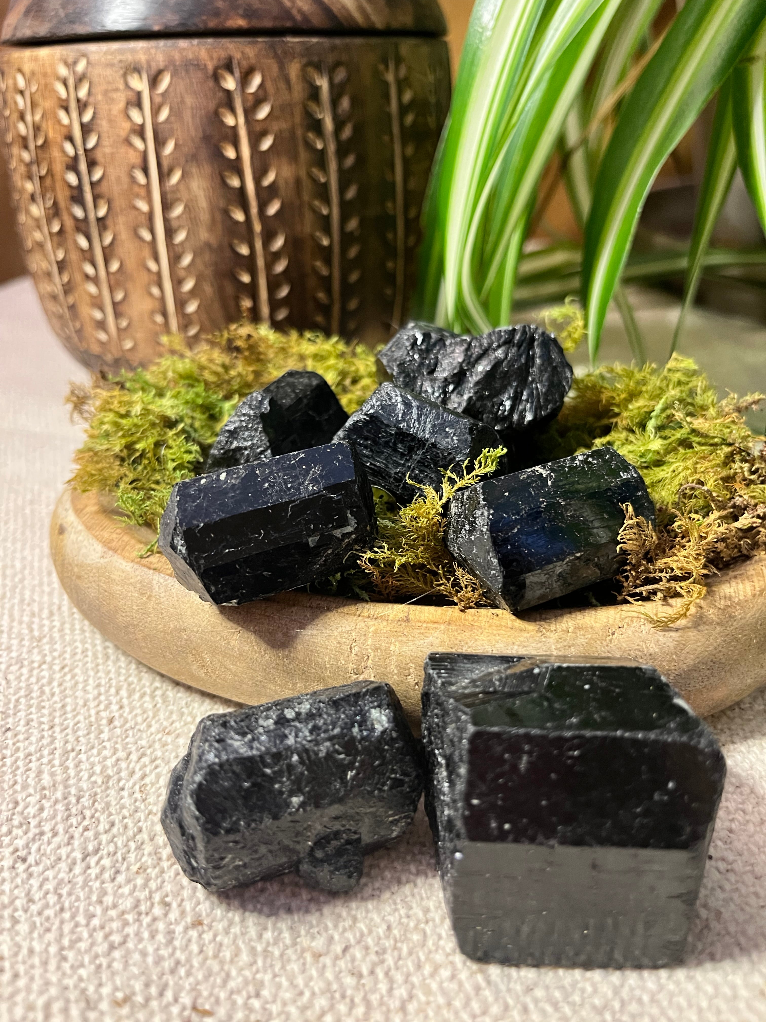 Chaque pierre brute de tourmaline mesure environ 4 cm de long sur 3cm de large et présente une texture naturelle qui révèle toute la force et l’authenticité du minéral.
